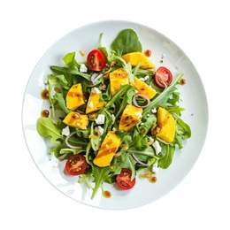 Lechuga fresca, tomate, cherry, mango, queso feta, cebolla caramelizada, vinagreta de mango natural y balsámico de Módena
