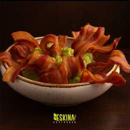 Crema de quesos, salsa picante, jalapeños, guacamole, cebolla frita y patatas caseras