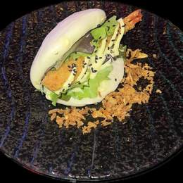 Bao esponjoso relleno de langostino tempura, lechuga, cebolla crujiente, sesamo y mayonesa japonesa con un rico toque picante.EN- Fluffy bao filled with tempura shrimp, lettuce, crispy onion, sesame and Japanese mayonnaise with a rich spicy touch.