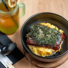 Arroz blanco, Filete de Unagi (Anguila), huevo medio cocido, salsa unagi, norí, sésamo blanco.White rice, Unagi (Eel) fillet, half-cooked egg, unagi sauce, nori, white sesame.