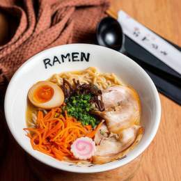 Fideos ramen con nuestro caldo tan-tan, bacon, medio huevo marinado, naruto y verduras Ramen noodles with our miso broth, bacon, half a marinated egg, naruto and vegetables