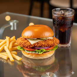 Pan Burger Brioche Gourmet, Hamburguesa con delicioso Pollo crujiente, cebolla crujiente, rodajas de pepinillo, lechuga fresca, rodajas de tomate + Patatas + Bebida.