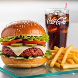 Pan Burger Brioche Gourmet, Deliciosa Carne de vacuno, cebolla crujiente picada, rodajas de pepinillo, lechuga fresca piccada, rodajas de tomate + Patatas + Bebida.