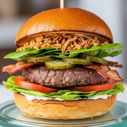 Pan Burger Brioche Gourmet, Hamburguesa de deliciosa carne de vacuno, Tiras de Bacon, cebolla crujiente, rodajas de pepinillo, lechuga fresca, rodajas de tomate.