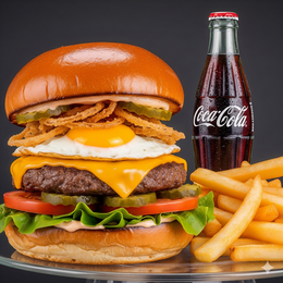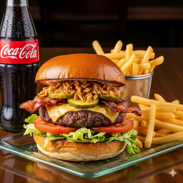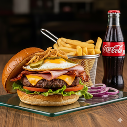 Pan Burger Brioche Gourmet, Hamburguesa de Carne de vacuno, cebolla crujiente picada, rodajas de pepinillo, queso cheddar, jamón york, huevo, Bacon, lechuga fresca picada, rodajas de tomate + Patatas + Bebida.
