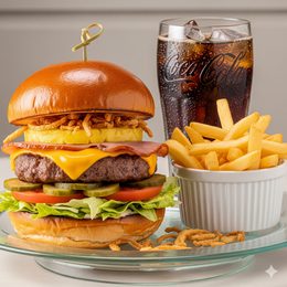 Pan Burger Brioche Gourmet, Carne de vacuno, cebolla crujiente picada, rodajas de pepinillo, queso cheddar, jamón York, rodaja de piña, lechuga fresca picada, rodajas de tomate.