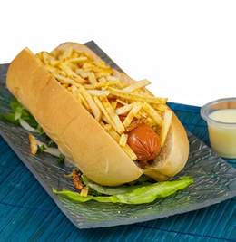 Hot dog (bocata) precocido a la plancha, papas paja, lechuga, mayonesa y kétchup
