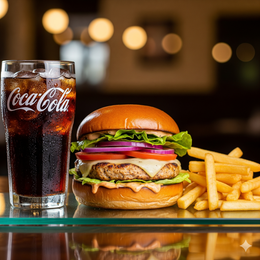 Pan Burger Brioche Gourmet, Deliciosa Carne de Vacuno, cebolla crujiente picada, rodajas de pepinillo, Tiras de beicon, lechuga fresca picada, Rodajas de tomate + Patatas + bebida.