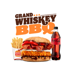 La famosa Grand Whiskey BBQ está de vuelta. La combinación de carne a la parrilla, salsa Whiskey BBQ y delicioso queso de cabra la hacen insuperable. Y además, con cebolla crujiente, bacon y tomate recién cortado entre pan de cerveza. Normal que tenga tantos fans. Todo esto, acompañado de patatas, bebida y tu king fusion con sabor a elegir.