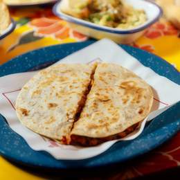 Carne de pastor con queso fundido a la plancha servida entre dos tortillas de harina de trigo.