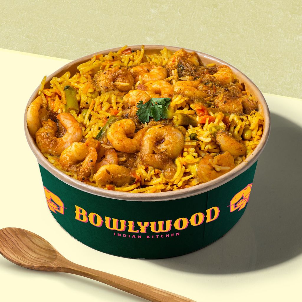 Plato icónico elaborado con arroz y especias Biryani, mezclado con deliciosas gambas peladas y sus verduritas.