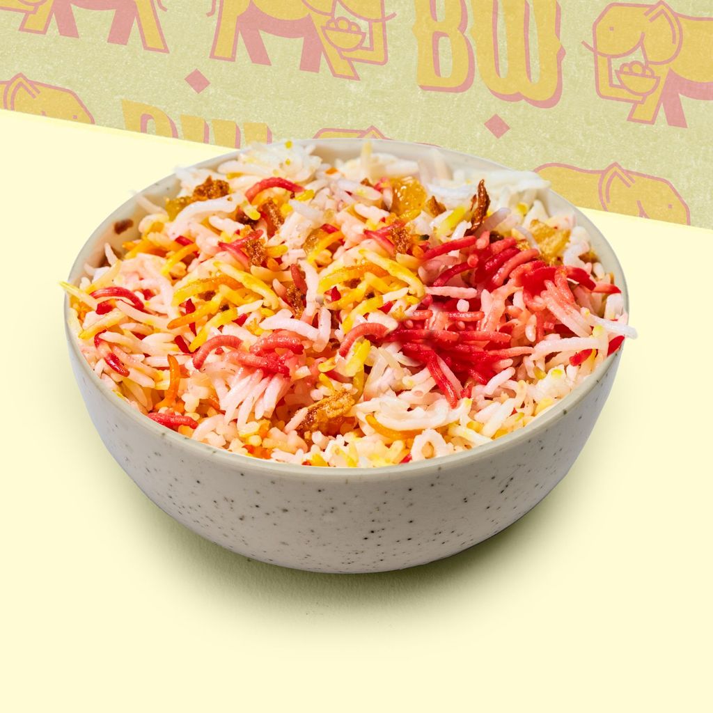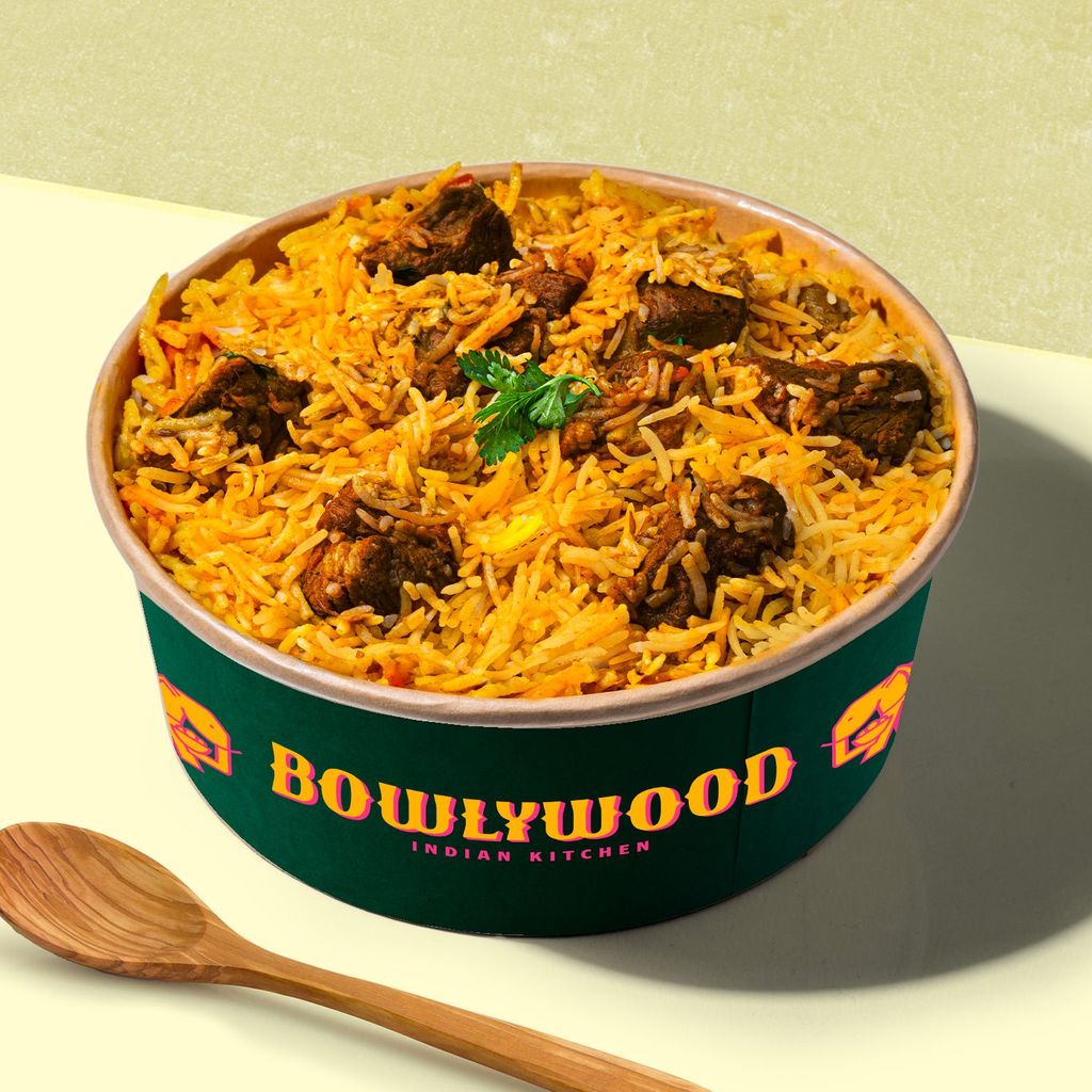 Plato icónico elaborado con arroz y especias Biryani, mezclado con deliciosos trozos de ternera con verduritas.