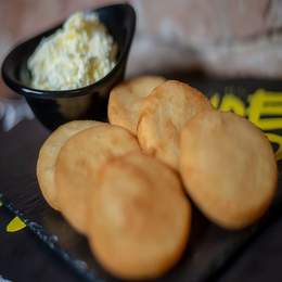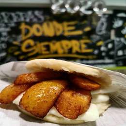 Masa de harina de maíz en forma de media luna, frita, rellena de ternera esmechada y queso gouda