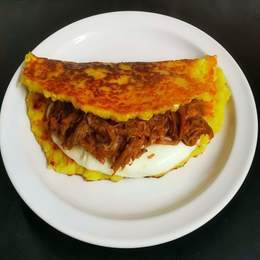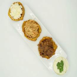 Masa de harina de maíz en forma de media luna, frita, rellena de ternera esmechada, frijoles negros, queso blanco y tajadas de maduro frito