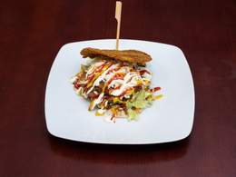 Plátano macho con ensalada fresca, ternera esmechada, queso blanco, ketchup, mayonesa y mostaza