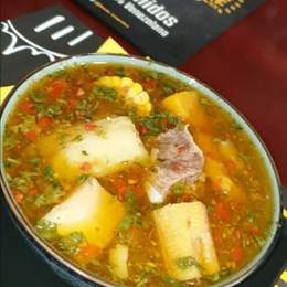 Sancocho de costillas de res con verduras, patatas, boniato, calabaza, yuca y plátano
