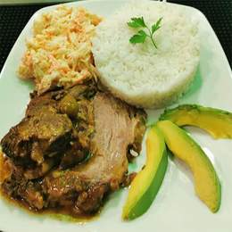 Arroz, ensalada rallada, plátano maduro frito, aguacate y arepita
