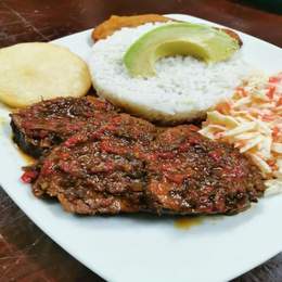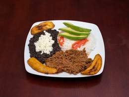 Ternera mechada, frijoles negros, queso blanco, tajadas y aguacate