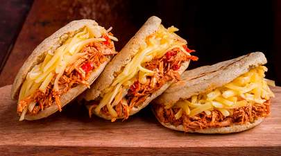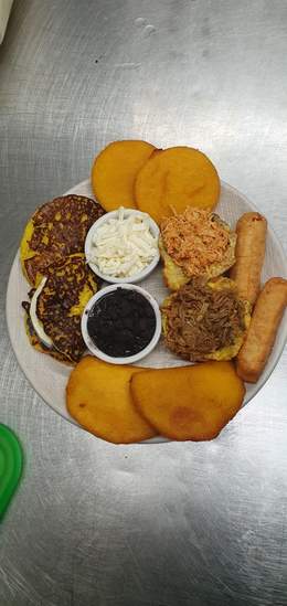 2 empanaditas rellenas de carne y pollo, 2 arepitas con queso y frijoles negros, 2 tequeños de queso, 2 cestas de plátano macho rellenas de carne y pollo y 2 cachapitas con queso. Tenemos opciones veganas y vegetarianas, sólo pídelo.
