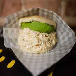 Pan brioche, lechuga, tomate, 180 gramos de pechuga de pollo aliñada, bacon, queso cheddar, patatas chips, ketchup, mayonesa y mostaza. Acompañadas de patatas fritas