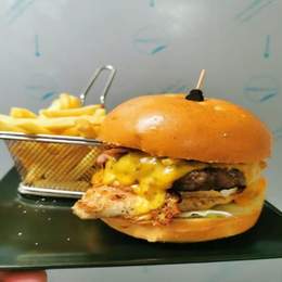 Pan brioche, lechuga, tomate, 180 gramos de ternera picada aliñada, 90 gramos de pechuga de pollo, bacon, huevo, queso cheddar, chorizo, patatas chips, ketchup, mayonesa y mostaza. Acompañadas de patatas fritas