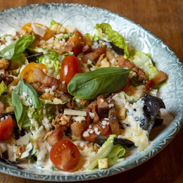 Hojas de cogollo de lechuga, croutons, tomate cherry multicolor, parmesano, guanciale y salsa césar tradicional