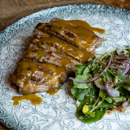 Presa de cerdo ahumada con salsa de vino dulce acompañada con ensalada de hojas baby