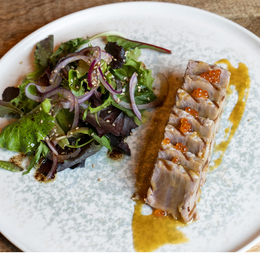 Láminas de atún a la plancha con salsa de miel, mostaza y soja acompañado con ensalada de hojas baby