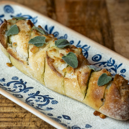 Pan tradicional acompañado de mantequilla con ajos asados, hierbas y mozzarella.
