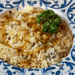 Arroz arborio mantecado con carrillera de cerdo guisada, su jugo y cebolla
