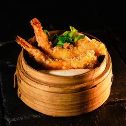 Gambas crujientes estilo singapore,salsa de sesamos