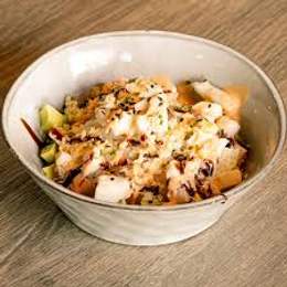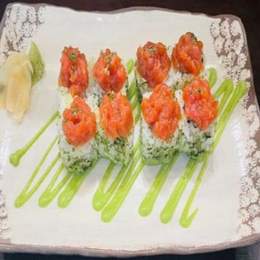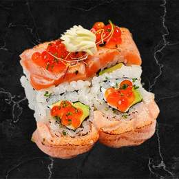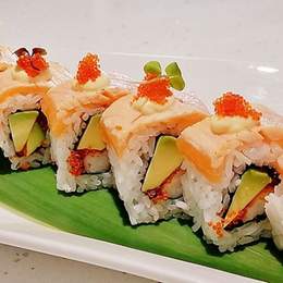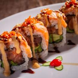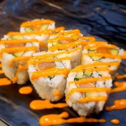 Base de arroz de sushi, salmón marinado, aguacate y cebolla frita,salsa spicy mayo y teriyaki.