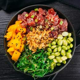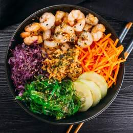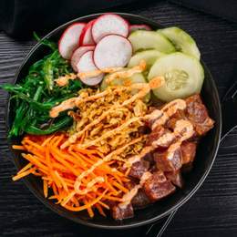 Diseña el bowl a tu gusto elige entre una gran variedad,elige hasta 2bases , 2proteinas , 6toppingsy 2salsas.