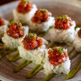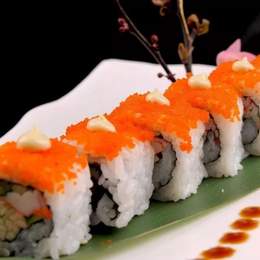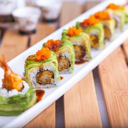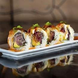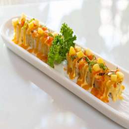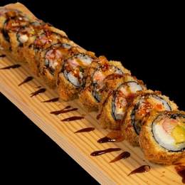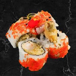 Base de arroz de sushi, pez mantequilla, aguacate, cebolla frita y salsa Trufa,spicy mayo y unagi anquila.