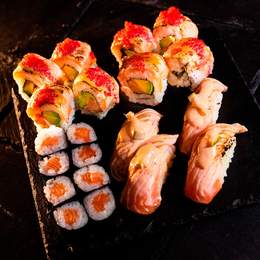 8 ud. Crazy Salmón roll / 8 Makis de salmón / 4 Nigiris de salmón flameado (20 uds.)