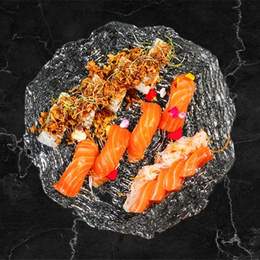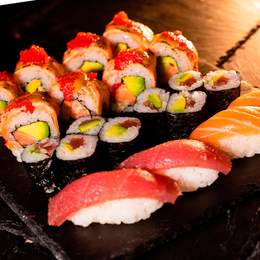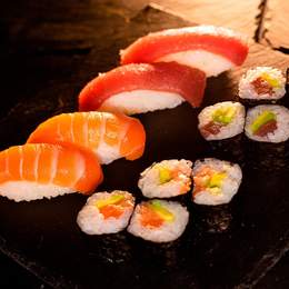 2 Nigiri de salmón, 2 nigiri de atún, 2 sashimi de salmón, 2 sashimi de atún, 4 maki de atún y 4 maki de salmón
