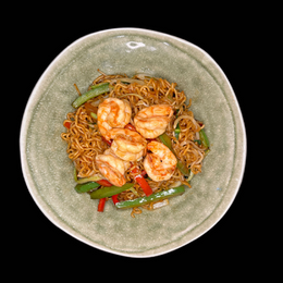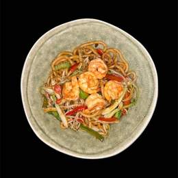 Tallarines finos japoneses al wok con gambas y,verduras mixta y salsa yakisoba.