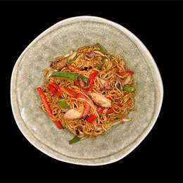 Tallarines japones salteado con pollo teriyaki y verduras mixta. Salsa yakisoba