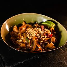 Tallarines ancho de arroz salteados al estilo Thai con salsa (tamarindo), gambas,Doufu, brotes de soja, huevo y col china,zanahoria cacahuetes . Servido con lima
