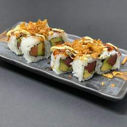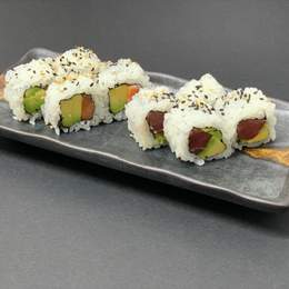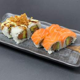 Tarta salmón roll sobre cebolla y salsa cremosa,(16 pzs) salmon flambeado salsa mayonesa spicy(4pzs)