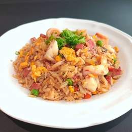 Arroz blanco, gamba frita, huevo con curry japonés, patata y zanahoria