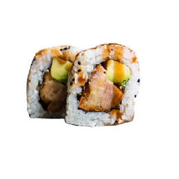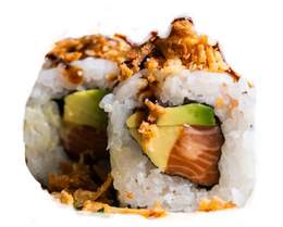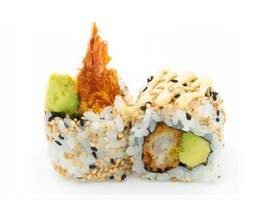 (8 Uds). Ingredientes: arroz, alga nori, gambas en tempura, aguacate, salmón, cebolla crujiente y salsa teriyaki.