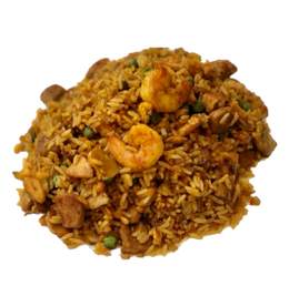 Arroz frito con salsa de soja dulce, con gambas, pollo y huevo frito.