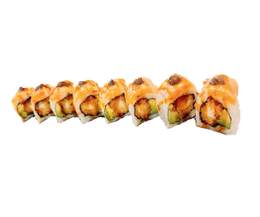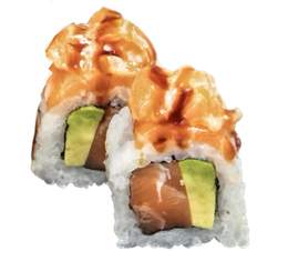 (8 Uds). California Roll relleno de gambas en tempura y aguacate, montado de salmón flameado con un toque de trufa y la salsa teriyaki.