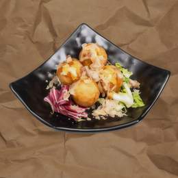 Croquetas japonesas de pulpo acompañadas con copos de bonito seco, mayonesa y salsa teriyaki
