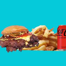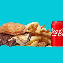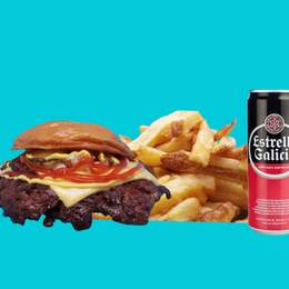 Crujientes patatas cubiertas con una mezcla de quesos bañadas en salsa cheddar fundida, acompañadas por una jugosa smash burger
