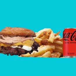 Doble carne 180gr acompañada de cebolla, pepinillos, kétchup y mostaza, todo entre dos capas de nuestro delicioso pan brioche.
