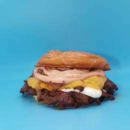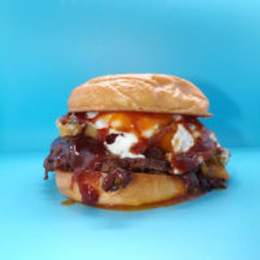 Doble carne 180gr con queso cheddar, aros de cebolla, salsa BBQ casera y un huevo frito, todo entre nuestro irresistible pan brioche.