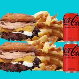 Dos original, acompañada de crujientes patatas y dos bebidas.