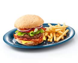 Hamburguesa con queso fundido, bacon ahumado, lechuga batavia, cebolla roja y tomate con guarnición de patatas fritas.